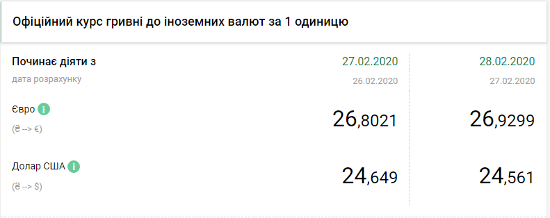 Национальный банк Украины на пятницу, 28 февраля, укрепил курс гривны на восемь копеек по отношению к доллару и на 12 копеек по отношению к евро, передает FaceNews.ua. Об этом свидетельствуют данные на сайте регулятора в четверг, 27 февраля.