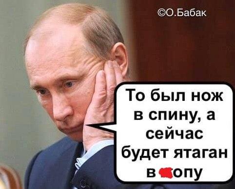 На картинке изображен президент Российской Федерации Владимир Путин, который якобы говорит фразу: "То был нож в спину, а теперь будет ятаган в ж*пу". Такая фотожаба стала реакцией на ответ турецкого руководства, которое пригрозило России новым конфликтом. Как известно, российские военные поддерживают правительственные войска Сирии, с которыми у турецкой армии идет вооруженное противостояние.