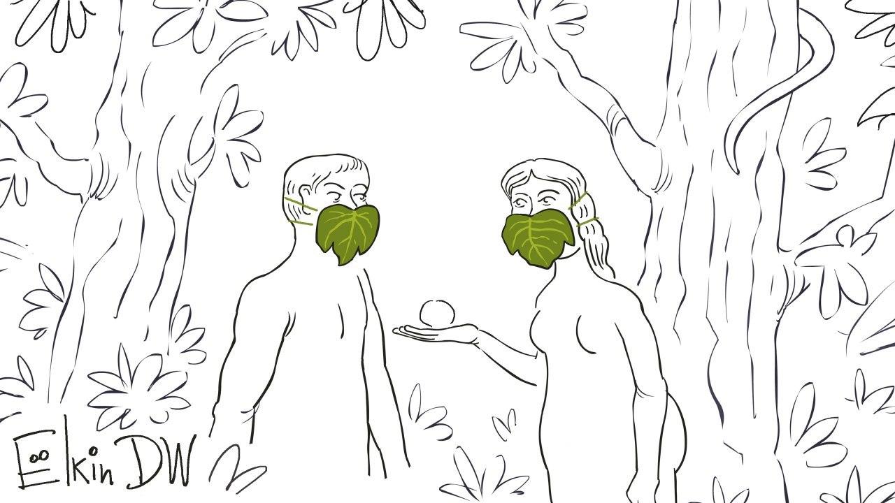 На картинке показали известную на весь мир сцену, на которой Ева передает яблоко Адаму. При этом вместо традиционных медицинских масок на их лицах были листья с дерева.