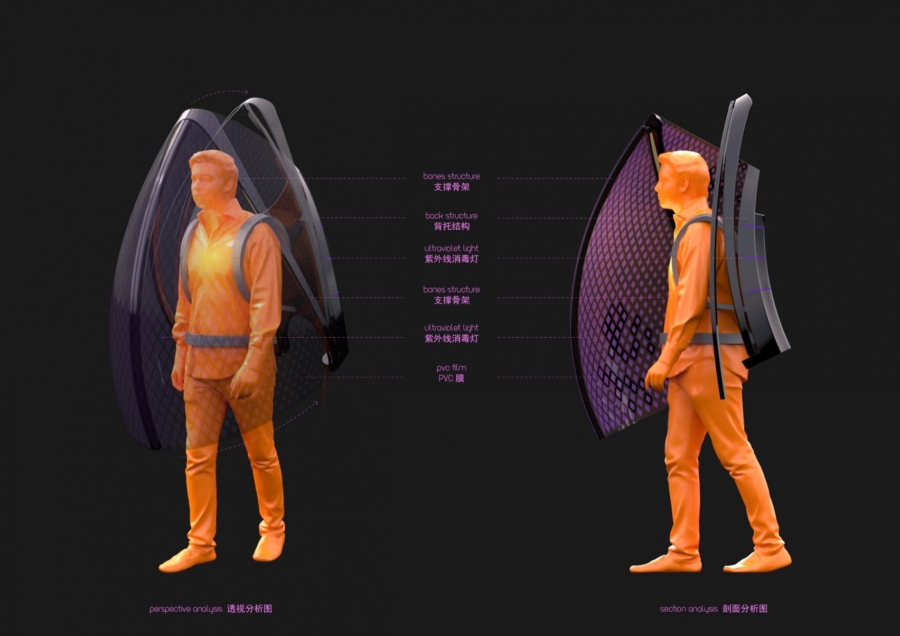 Устройство, названное дизайнером "Be the Bat Man" (Будь Бэтменом), состоит из термопластичных листов в форме крыльев летучей мыши. Оно оснащено ультрафиолетовыми лампами, которые нагреваются до температуры достаточно высокой, чтобы убить любые патогенные микроорганизмы в воздухе, стерилизуя среду вокруг пользователя.