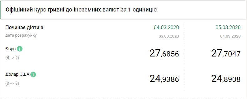 Национальный банк Украины (НБУ) на 5 марта 2020 года установил официальный курс на уровне 24,89 гривен за доллар, что на 4 копейки ниже по сравнению с предыдущим банковским днем, передает FaceNews.ua. Об этом свидетельствуют данные на сайте регулятора.