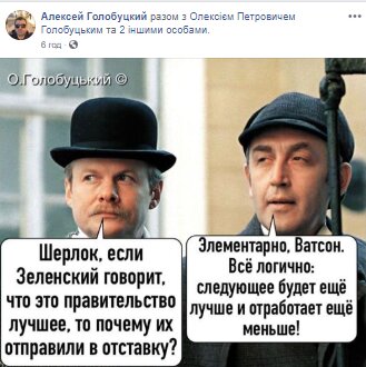 Так, блогер опубликовал картинку, на которой стоят Шерлок Холмс и Доктор Ватсон. При этом Ватсон произносит слова: "Шерлок, если Зеленский говорит, что это правительство лучшее, то почему их отправили в отставку?". Рядом стоит Шерлок, из уст которого выходят слова: "Элементарно, Ватсон. Все логично: следующее будет еще лучше и отработает еще меньше".