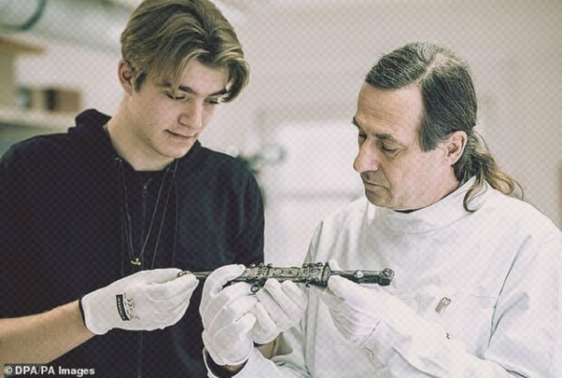 Специалисты потратили целых 9 месяцев на то, чтобы отчистить находку от ржавчины. И им это удалось. Под толстым слоем ржавчины оказалось прекрасно сохранившееся оружие с искусной, даже роскошной инкрустацией, которая, как оказалось, даже не повредилась за 2 тысячи лет в земле.