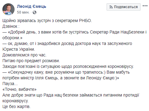 В СНБО ошиблись номером и пригласили не того Емца на встречу по коронавирусу