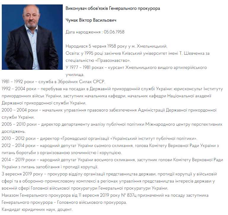 Согласно информации на сайте Офиса генпрокурора, Чумак исполняет обязанности генпрокурора. Отметим, до отставки Руслана Рябошапки он был одним из его заместителей.