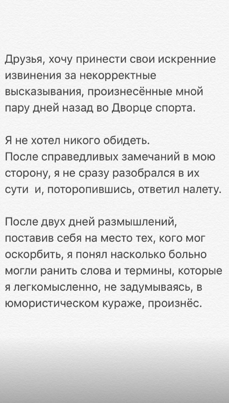 "Друзья, этим постом хочу принести свои искренние извинения за некорректные высказывания, произнесенные мной пару дней назад во Дворце спорта. Я не хотел никого обидеть. После справедливых замечаний в мою сторону, я не сразу разобрался в их сути и, поторопившись, ответил налету",- написал Остапчу