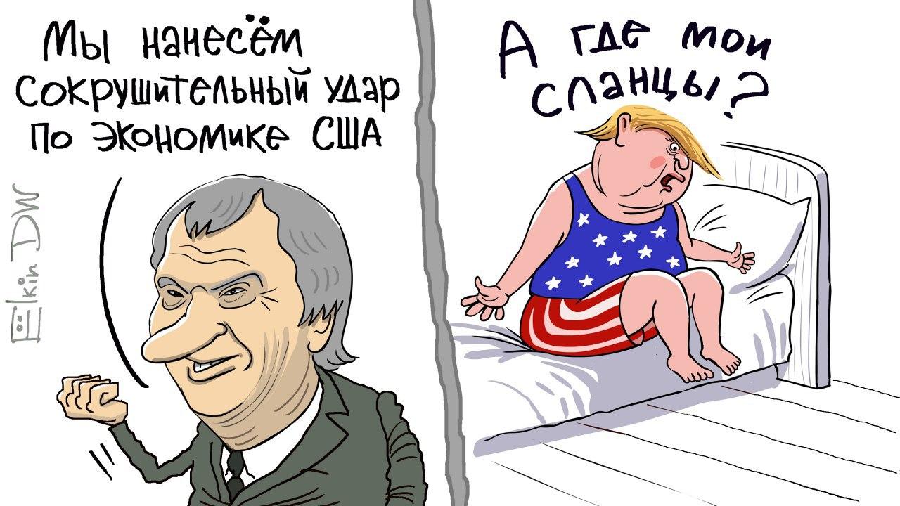 На ней изображен Дональд Трамп встающий с кровати и сетующий, что не может найти свои сланцы, а рядом российский персонаж, который коварно говорит: "Мы нанесем сокрушительный удар по экономике США". Он ведет некую "войну" пытаясь навредить.
