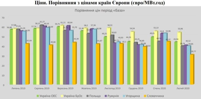 В феврале ближе всего к Украине среди стран-соседей цена на э / э была в Румынии. В ОЭС она была дороже на 8%, в Бурштынском острове - на 33%.