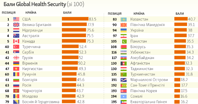 Согласно рейтингу Global Health Security Украина находится на 94 позиции из 195 стран по готовности к эпидемиям и пандемиям.