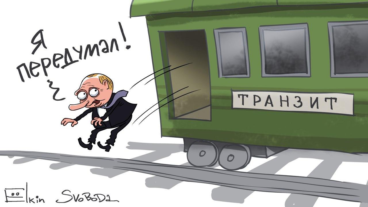 В своей работе художник показал Путина, которого выгоняют из поезда с табличкой "транзит". При этом российский президент говорит фразу "Я передумал".