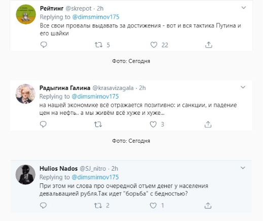 В результате на странице журналиста началось бурное обсуждения на эту тему и многие откровенно высмеяли позицию Путина относительно ситуации с нефтью. Пользователи осмелились напомнить, что в то время, когда черное золото стоило в четыре-пять раз дороже, экономического прорыва в России почему-то так и не произошло.Юзеры подчеркнули, что судя по всему, эта такая своеобразная тактика у Владимира Путина - свои промахи выдавать за достижения.