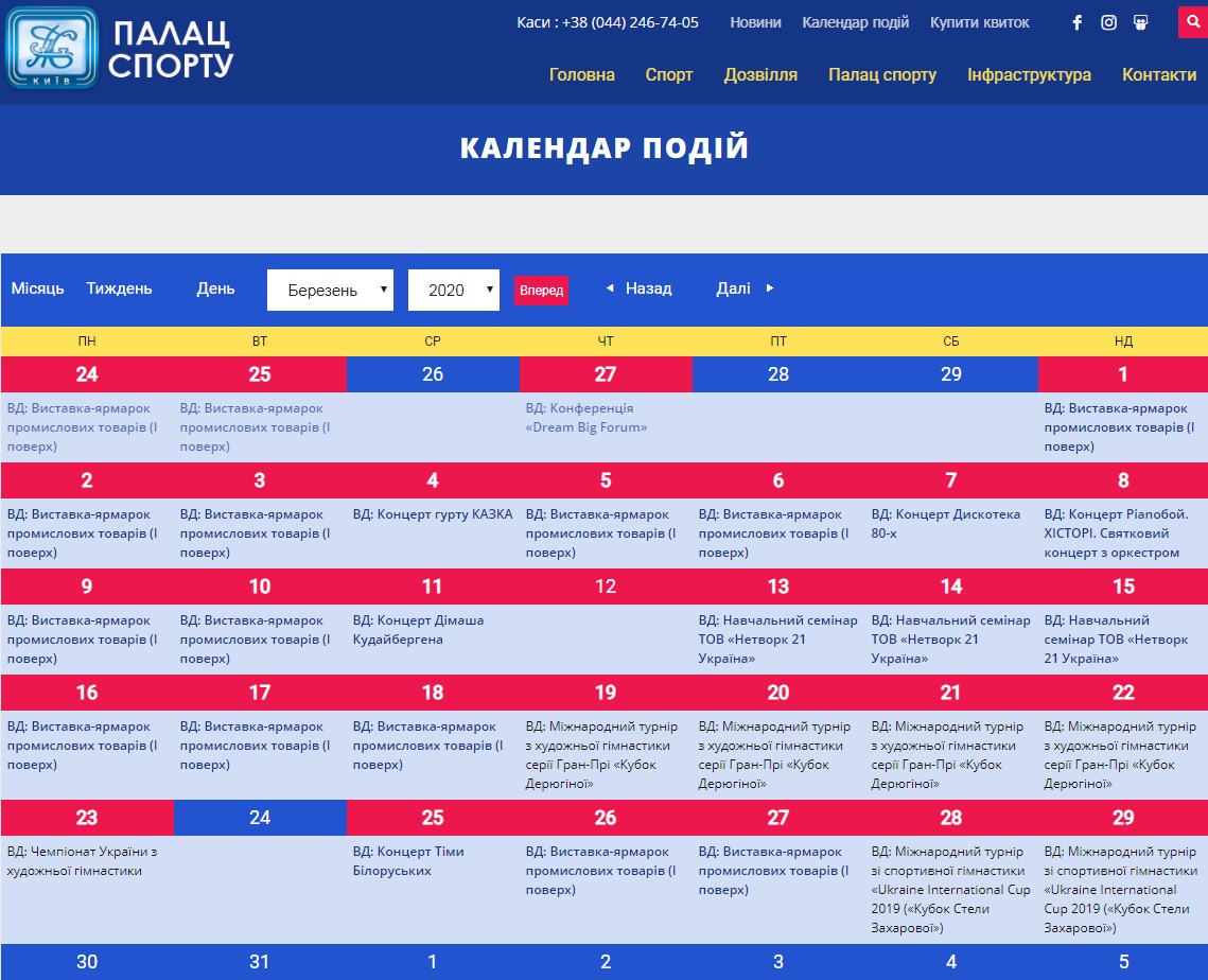 Что касается «Киевского Дворца Спорта», то непохоже, чтобы запланированные на март события отменяли. Во-первых, в расписании остаются семинары и выставки-ярмарки, и точно известно, что 19 марта стартует Международный турнир по художественной гимнастике серии Гран-При «Кубок Дерюгиной».