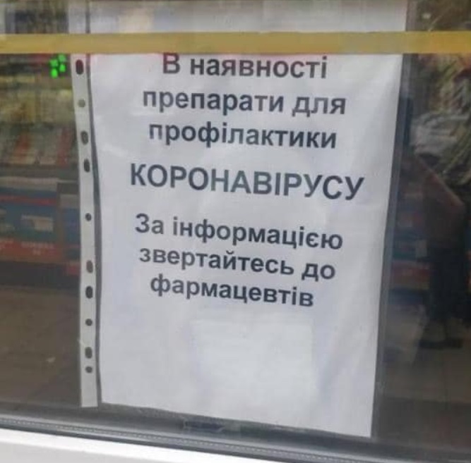 "В наявности препараты для профилактики коронавируса. За информацией обращайтесь к фармацевтам", - говорится в объявлении на аптеке.