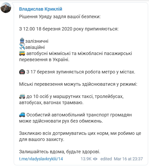 Министр инфраструктуры Владислав Криклий заявил, что с 17 марта в Украине будет остановлена работа метрополитена.