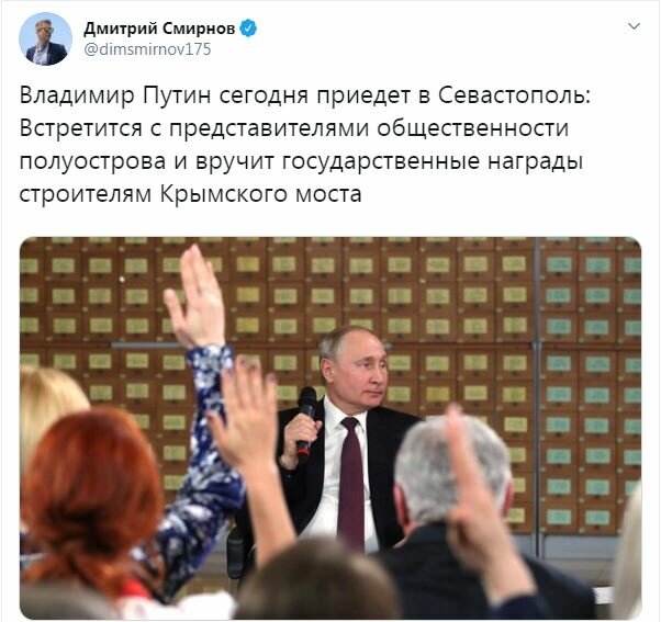 "Владимир Путин сегодня приедет в Севастополь: Встретится с представителями общественности полуострова и вручит государственные награды строителям Крымского моста", - говорится в публикации.