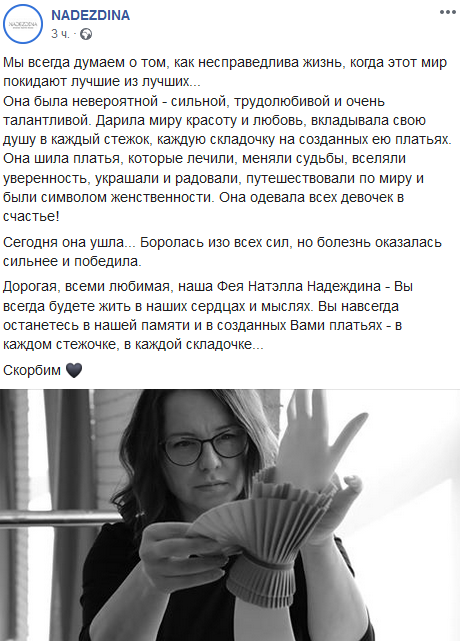 В среду, 18 марта, ушла из жизни украинский дизайнер Натэлла Надеждина, владелица бренда NADEZDINA, у которой одевались звезды шоу-бизнеса, передает FaceNews.ua.
