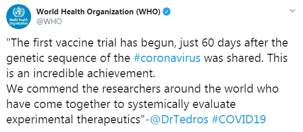"Первое испытание вакцины началось, всего через 60 дней после того, как была передана генетическая последовательность коронавируса. Это невероятное достижение. Мы благодарим исследователей по всему миру, которые собрались вместе, чтобы систематически оценивать экспериментальную терапию", - заявил глава ВОЗ.