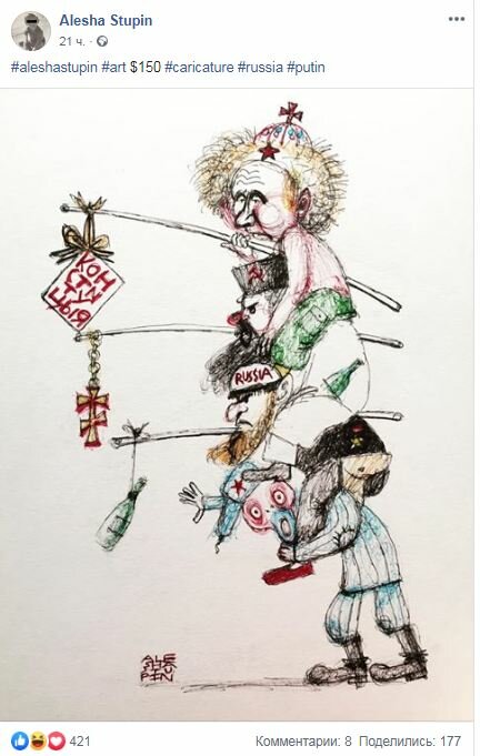 Художник Алеша Ступин изобразил всех указанных лиц в меткой карикатуре. Так, на картинке изображен ватник, который держит на плечах всех, включая Путина и Кадырова. Чтобы человек внизу двигался, ему перед глазами повесили палку с бутылкой водки.