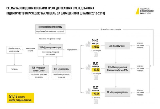 Следствие установило, что в течение 2016-2018 годов группа лиц организовала схему, в результате которой фактически установила контроль за государственными закупками трех государственных предприятий – ГП Селидовуголь, ГП Мирноградуголь и ГП Шахтоуправление Южнодонбасское №1.