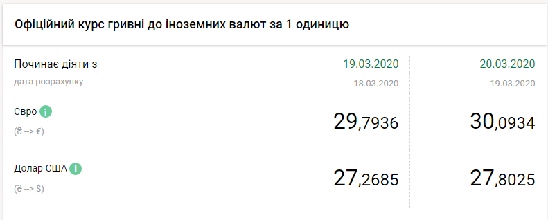 Национальный банк Украины на пятницу, 20 марта, ослабил курс гривны на 54 копейки по отношению к доллару и 30 копеек по отношению к евро, передает FaceNews.ua. Об этом свидетельствуют данные на сайте НБУ в четверг, 19 марта.