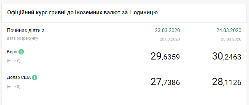 Национальный банк Украины на вторник, 24 марта, понизил курс гривны на 38 копеек по отношению к доллару и на 61 копейку по отношению к евро, передает FaceNews.ua. Об этом свидетельствуют данные на сайте НБУ в понедельник, 23 марта.