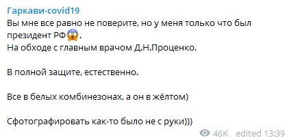 «Нам все равно, каким именно способом чрезвычайная важность происходящего была донесена до президента. А в данном случае — самым правильным. С использованием слуховых, зрительных, тактильных импульсов. С „практическими занятиями“ (переодевание). С предварительной подготовкой, естественно, как иначе? Повторюсь, не разделяю в этой связи критики в адрес доктора Дмитрия Гаркави, что принял посильное участие в этом шоу в качестве пациента (а пациент-то Дмитрий самый что ни на есть всамделишный, к счастью, не коронавирусный). Бросился на амбразуру, так сказать. Смеетесь? Что же, какие времена, такие и амбразуры».