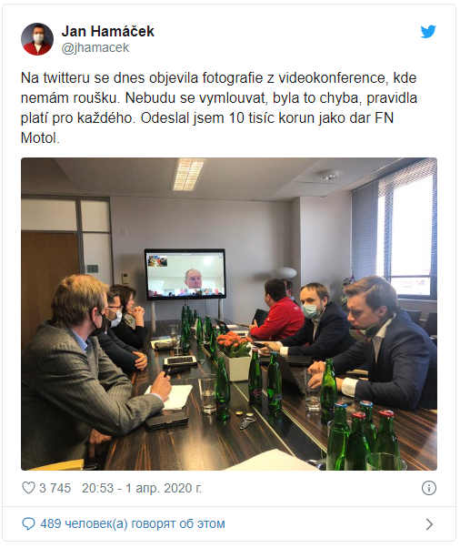 "Сегодня в Twitter появилась фотография с видеоконференции, где у меня нет маски. Я не собираюсь оправдываться, это была ошибка, правила распространяются на всех. Я отправил 10 тыс. крон (около $400, - ред.) на счет больницы Motol" - написал Гамачек в Twitter.