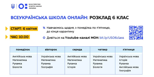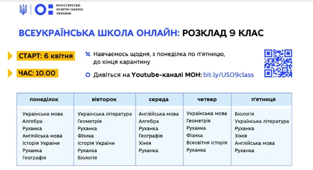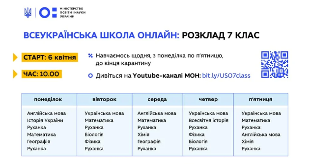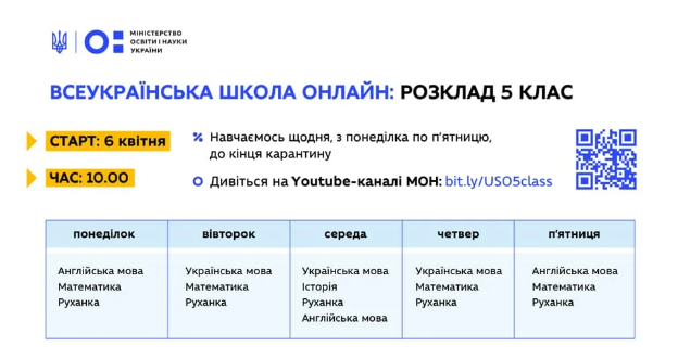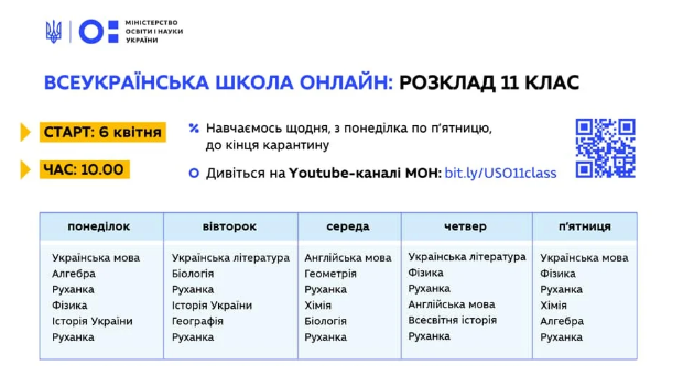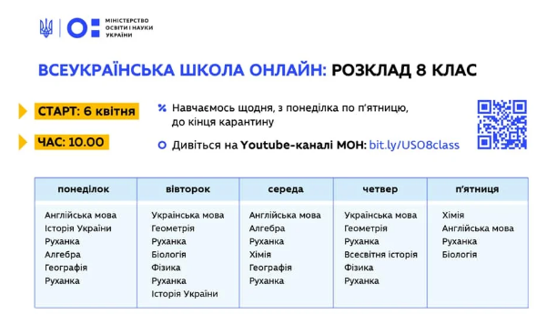Как сообщили в Министерстве образования, будут транслироваться уроки: по украинскому языку, украинской литературе, истории Украины, всемирной истории, английскому языку, физике, алгебре, геометрии, географии, химии и биологии.