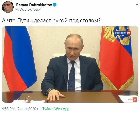 "Оттягивает свой конец", "QR-код свой держит", "Захарову одергивает", "Путина пристегнули наручниками к столу", "Его беспокоит Гондурас... Говорили же ему: не трогай грязными руками", "Памперс проверяет - не протек ли?", "Вирус словил..в кулачке держит", "Рейтинг поднимает", "Держится за скрепу", "Путин объявил, что эта рука еще 30 дней будет нерабочей", "Поднимает Россию с колен!", "Живого из себя корчит", "Обнуляется", "Проверяет, не бабушка ли оно случайно", "Пальцы скрестил и говорит о сохранении зарплаты", - шутят пользователи в комментариях под публикацией.