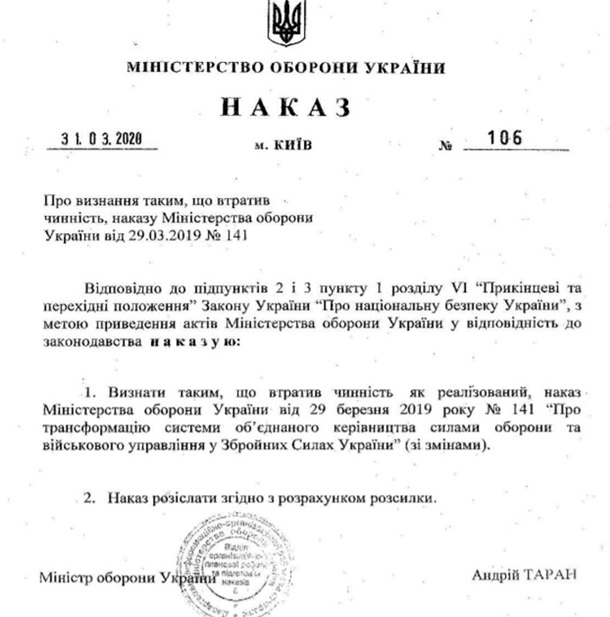 В частности, Таран подписал приказ №106, которым приказ Полторака №141 признал "реализованным", и, соответственно, потерявшим действие, 31 марта.