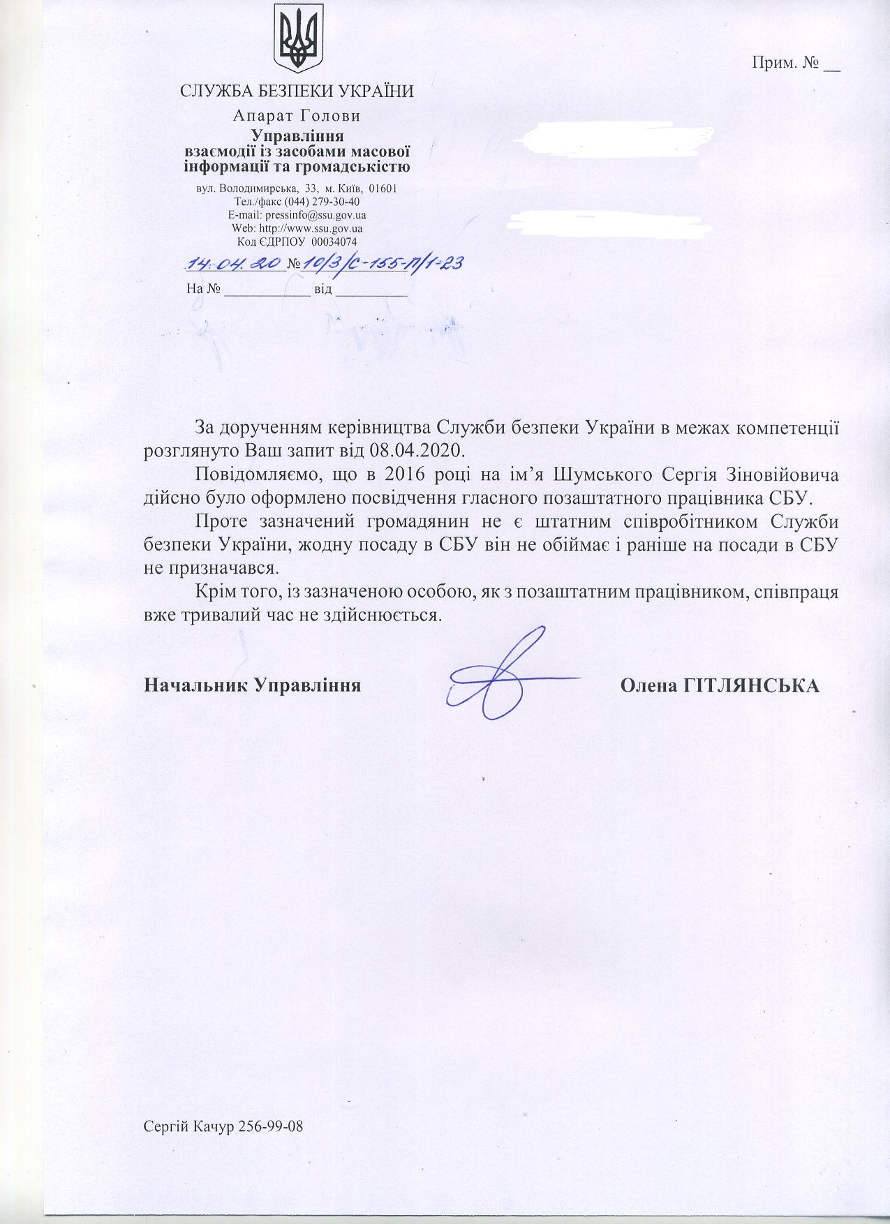 В своем ответе ведомство уведомляет, что на Сергея Шумского в 2016 году было оформлено удостоверение гласного внештатного сотрудника СБУ. Но Шумский никогда не был штатным сотрудником СБУ, на должности ведомства не назначался и сейчас сотрудничество с ним как с внештатным сотрудником "уже длительное время не осуществляется".