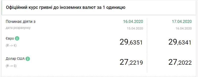 Национальный банк Украины (НБУ) на 17 апреля 2020 года установил официальный курс на уровне 27,20 гривен за доллар, что на 2 копейки ниже по сравнению с предыдущим банковским днем, передает FaceNews.ua. Об этом свидетельствуют данные на сайте регулятора.