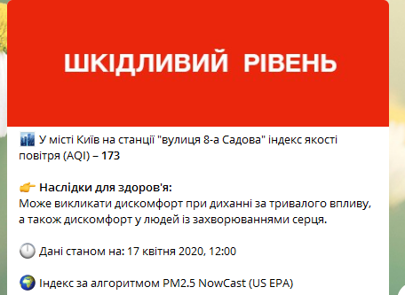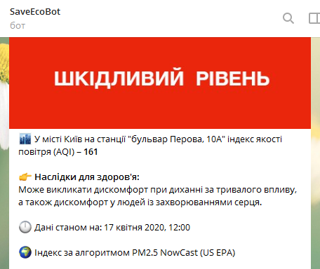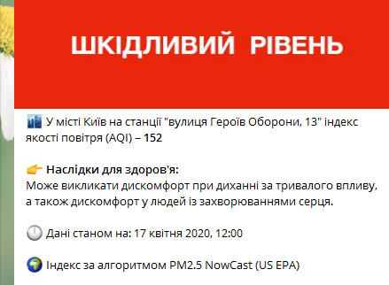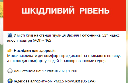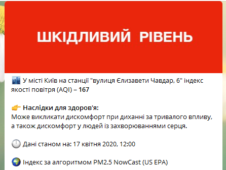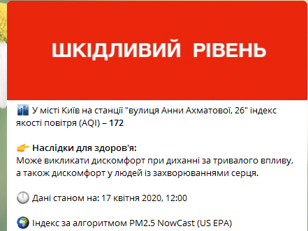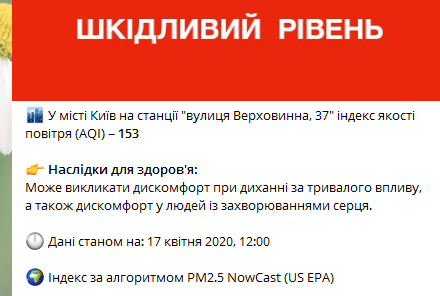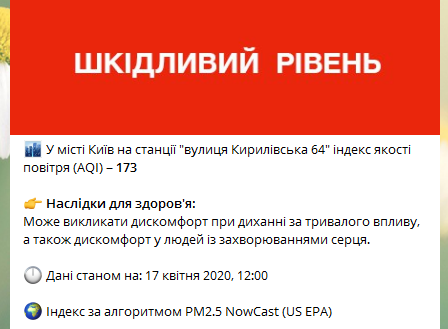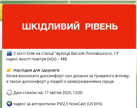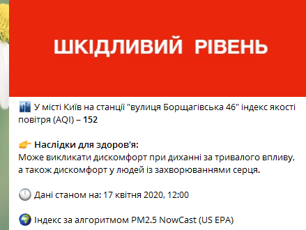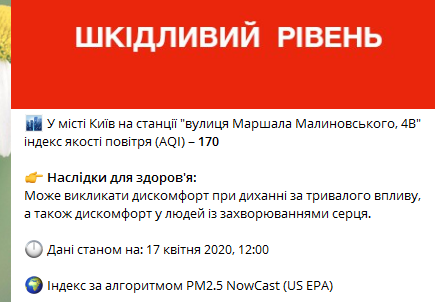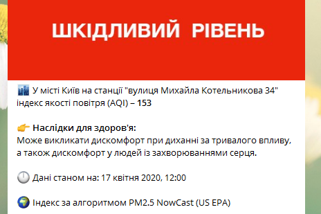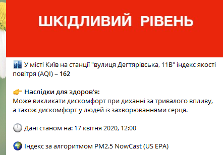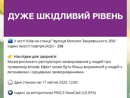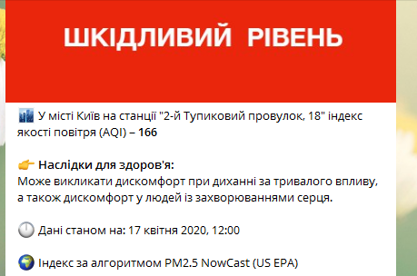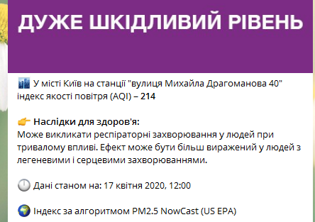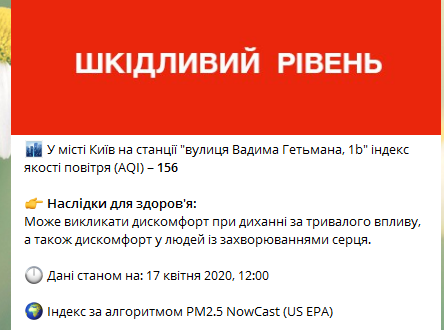 По данным телеграмм-бота SaveEcoBot, наиболее всего воздух загрязнен на ул. Драгоманова, ул. Закревского. Там индекс качества воздуха превышает 200.
