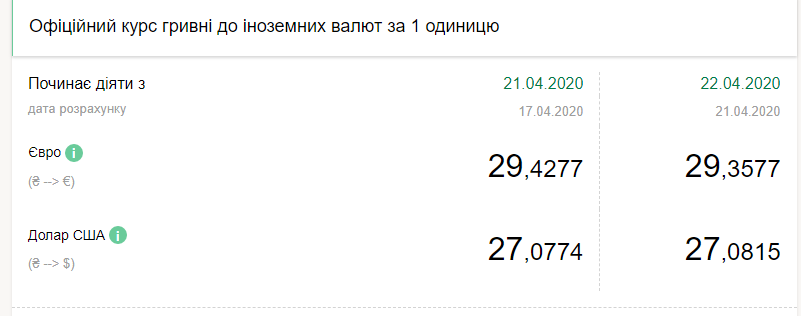 Национальный банк Украины на среду, 22 апреля, оставил практически без изменений курс гривны по отношению к доллару и на 7 копеек укрепил по отношению к евро, передает FaceNews.ua. Об этом свидетельствуют данные на сайте регулятора во вторник 21 апреля.