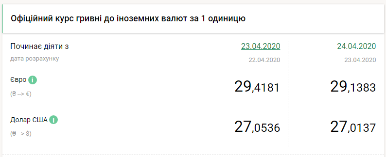 Национальный банк Украины (НБУ) на 24 апреля 2020 года установил официальный курс на уровне 27,01 гривен за доллар, что на 4 копейки ниже по сравнению с предыдущим банковским днем, передает FaceNews.ua. Об этом свидетельствуют данные на сайте регулятора.