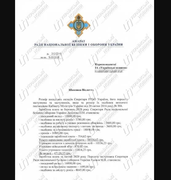 "За март 2020 года секретарю СНБО А. Данилову всего начислено 58 535 гривен заработной платы. Налог с дохода физических лиц — 10 536, военный сбор — 878 гривен. Всего удержано 11 414 гривен налогов. К выдаче — 47 120 гривен", — говорится в сообщении аппарата.