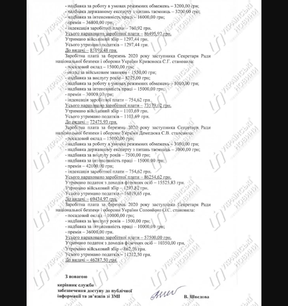 У заместителя секретаря СНБО Алексея Соловьева зарплата составила 57,5 тысяч гривен, при этом выдали ему 46,3 тысяч. Другой его заместитель Сергей Кривонос получил 72,5 тысяч гривен, а Сергей Демедюк – 69,5 тысяч гривен.