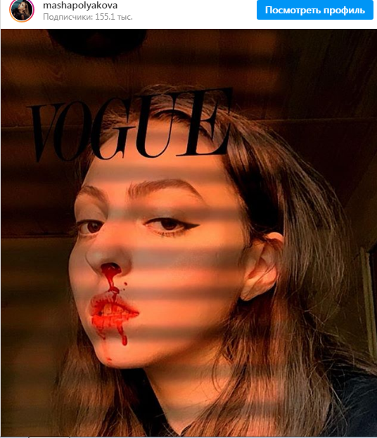 На снимке, который девушка опубликовала на своей странице в Instagram, Мария позирует с окровавленным носом и ртом, из которых вытекают капли крови. Девушка снялась напротив окна с распущенными волосами и стрелками на глазах.