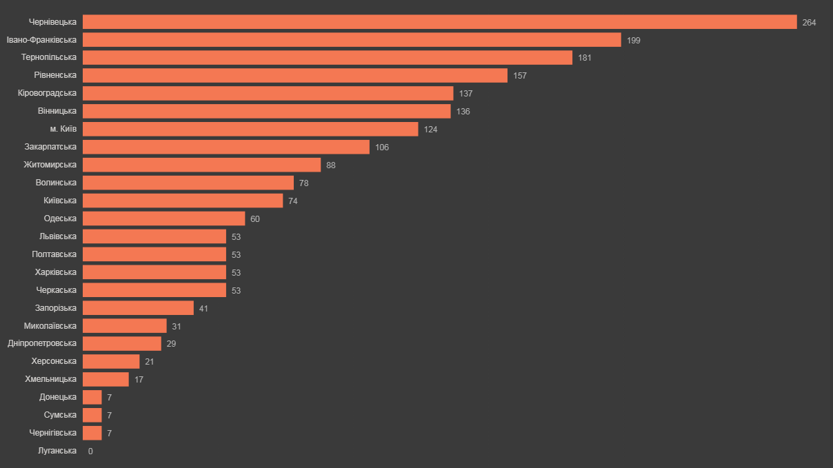 "Больше всего инфицированных медицинских работников в Черновицкой области: 264 человека. Однако в соотношении к общему количеству больных в области лидирует Кировоградская (36%), Винницкая (33%) и Волынская с Полтавской (по 28%) области", - сообщили в Минздраве