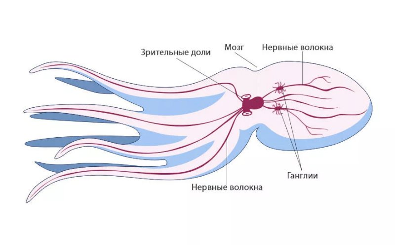 Помимо трех сердец, эти животные обладают очень необычным мозгом. Он содержит почти пятьсот миллионов нервных клеток — не так много по сравнению с человеческими 85 миллиардами, но вполне сопоставимо с количеством нейронов в мозге собаки. Однако у осьминогов клетки крупнее и иначе распределены по телу. Если у людей большая часть нейронов сосредоточена в мозге, то у головоногих на этот орган приходится только около десяти процентов. Еще 30 процентов расположены в крупных зрительных долях. Остальные — в ганглиях — скоплениях нейронов на конечностях.