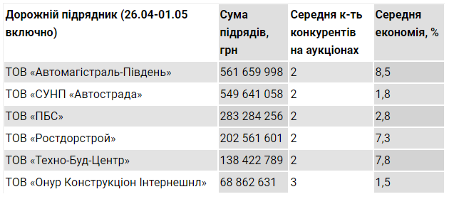Из первой по размеру сотни сделок на сумму 5,72 млрд грн. почти три десятка договоров стоимостью 2,80 млрд грн касающиеся ремонта дорог Укравтодора и местных органов власти.