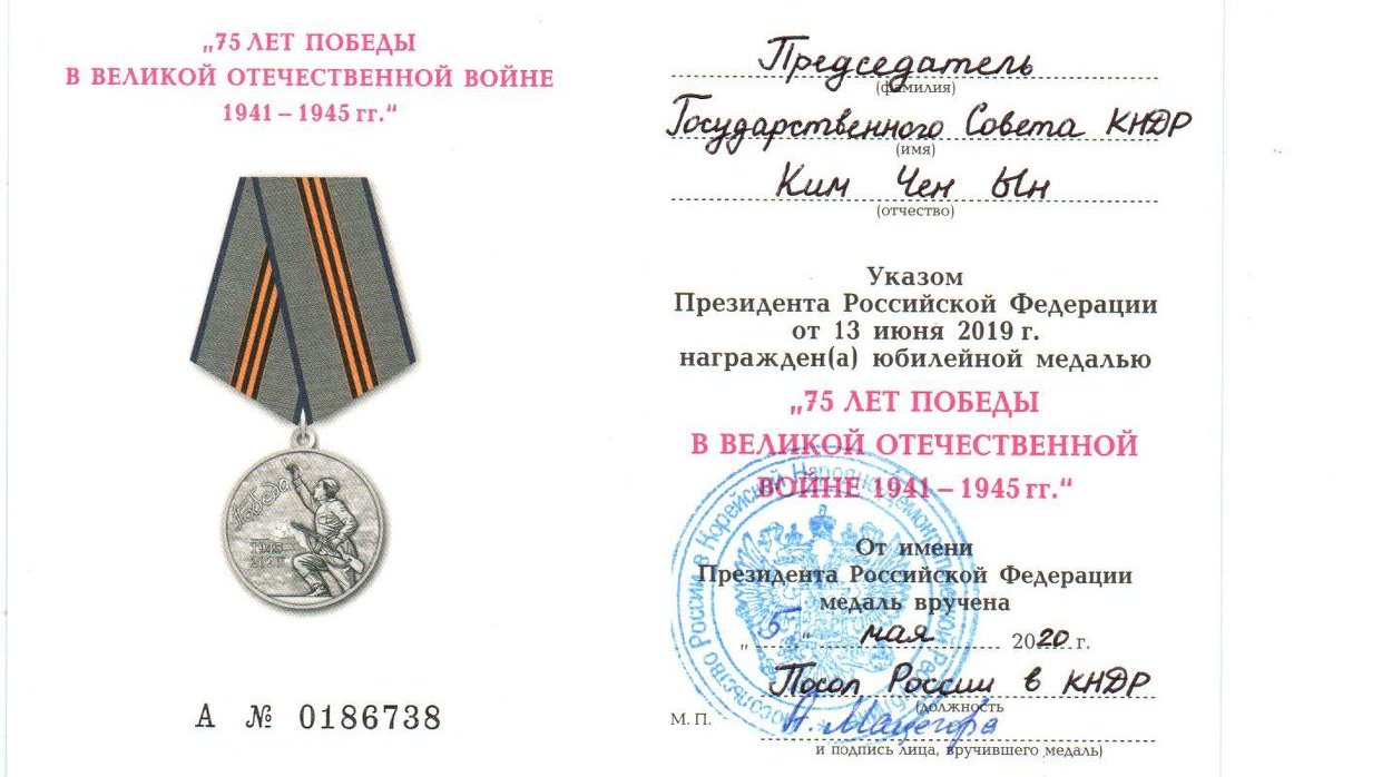 "В соответствии с Указом Президента Российской Федерации, Председатель Государственного совета КНДР Ким Чен Ын награжден юбилейной медалью "75 лет Победы в Великой Отечественной войне 1941-1945 гг." за большой личный вклад в увековечение памяти погибших и погребенных на территории КНДР советских граждан и проявленную заботу о сохранности захоронений и мемориалов советских воинов в Корейской Народно-Демократической Республике", – говорится в сообщении.