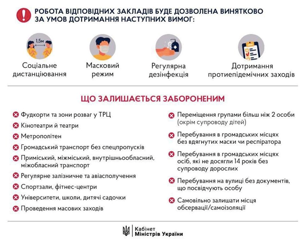 "В понедельник правительство приняло решение об ослаблении карантина с 11 мая. На следующей неделе будет возобновлена работа части заведений, однако при условии соблюдения противоэпидемических мероприятий", - написал Шмыгаль.