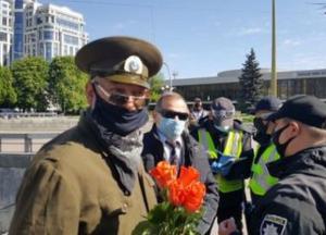 На акцию ко Дню Победы над нацизмом в Киеве пришел мужчина в пилотке с кокардой СССР. Полиция попросила мужчину снять ее и отдать для составления админпротокола, так как это сейчас запрещенная в Украине символика. Но мужчина отказался отдавать головной убор.