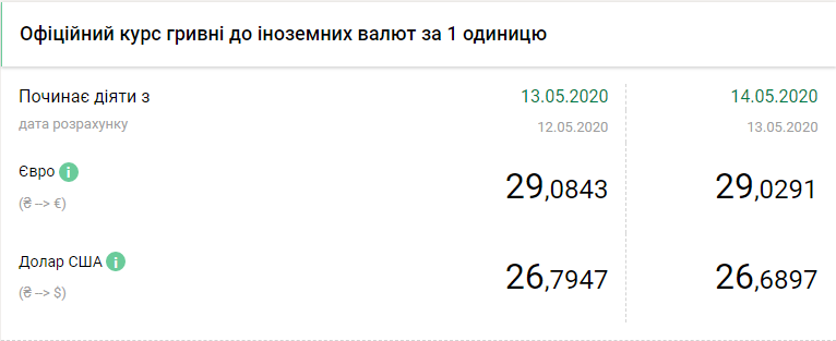 Национальный банк Украины на четверг, 14 мая, укрепил курс гривны на 10,5 копеек по отношению к доллару и на 5,5 копеек по отношению к евро, передает FaceNews.ua. Об этом свидетельствуют данные на сайте НБУ в среду, 13 мая.