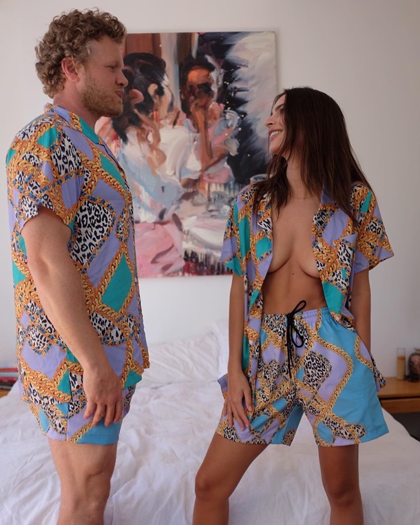 На снимках супруги запечатлены в костюмах из одинаковой ткани с разноцветным принтом. Они надели рубашки и короткие шорты, при этом Ратаковски расстегнула наряд, частично обнажив грудь.