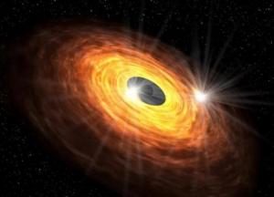 Сама черная дыра не производит никакого излучения. Источником излучения света палящий газообразный диск вокруг черной дыры. Газ вокруг черной дыры не направляется прямо в гравитационную скважину, но вращается вокруг черной дыры, образуя аккреционный диск.
