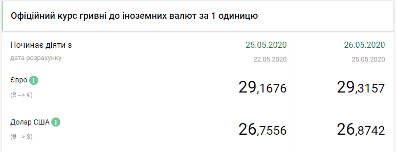 Национальный банк Украины на вторник, 26 мая, опустил курс гривны почти на 13 копеек по отношению к доллару и на 15 копеек по отношению к евро, передает FaceNews.ua. Об этом свидетельствуют данные на сайте НБУ в понедельник, 25 мая.
