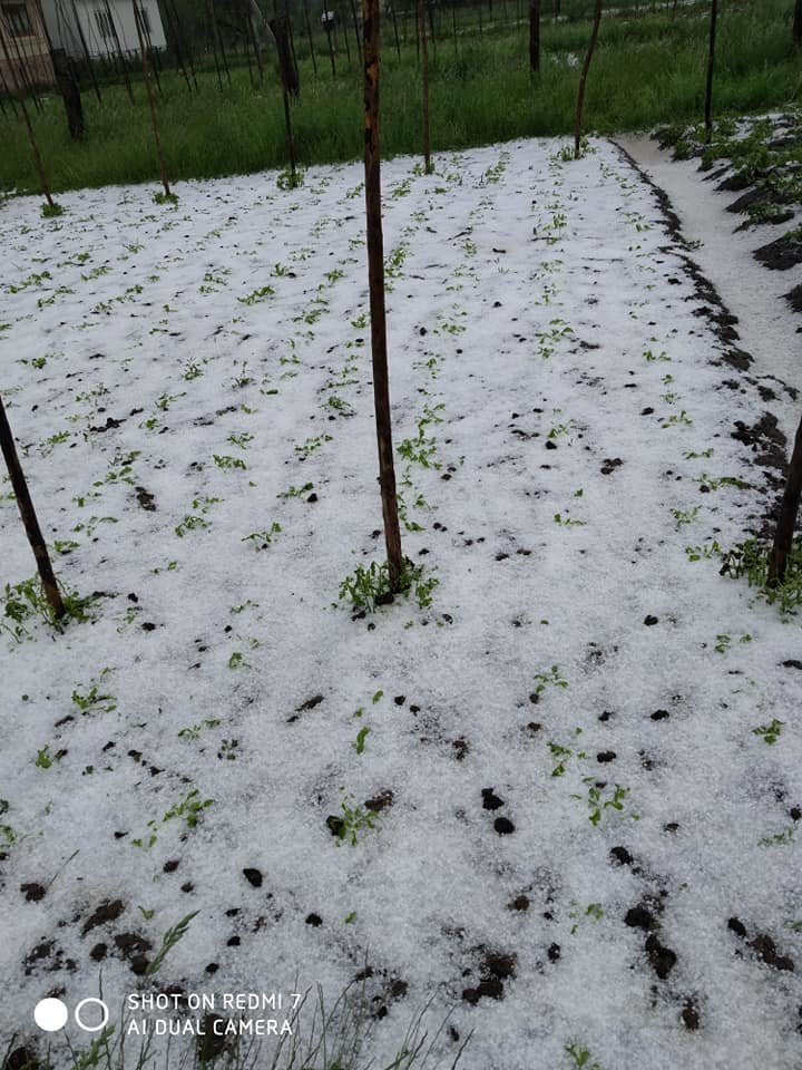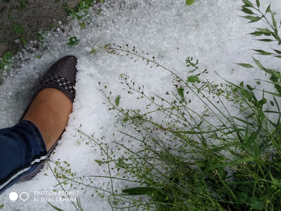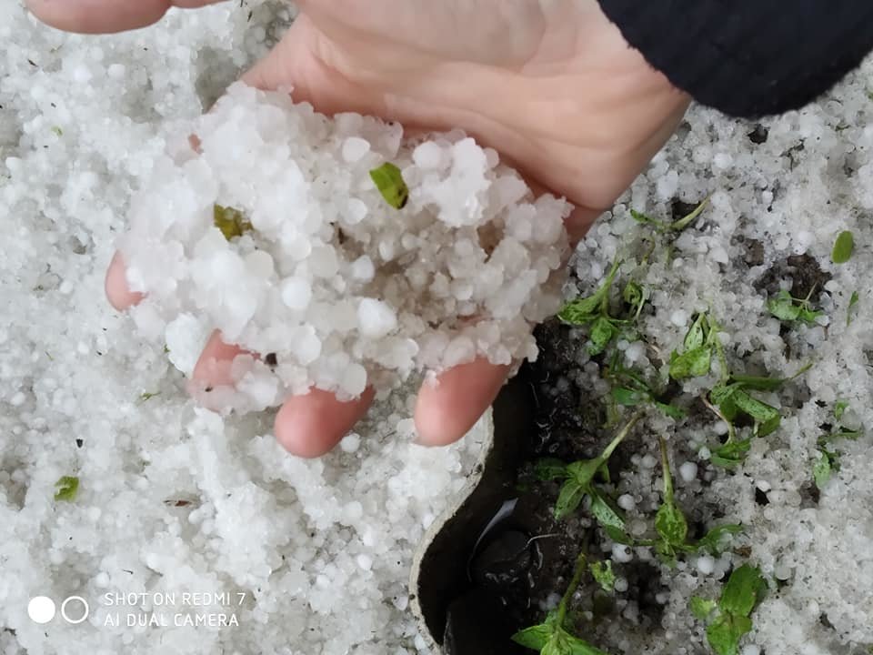 На кадрах можно увидеть, что слой града, укрывшего землю плотный, растения побиты и поломаны.