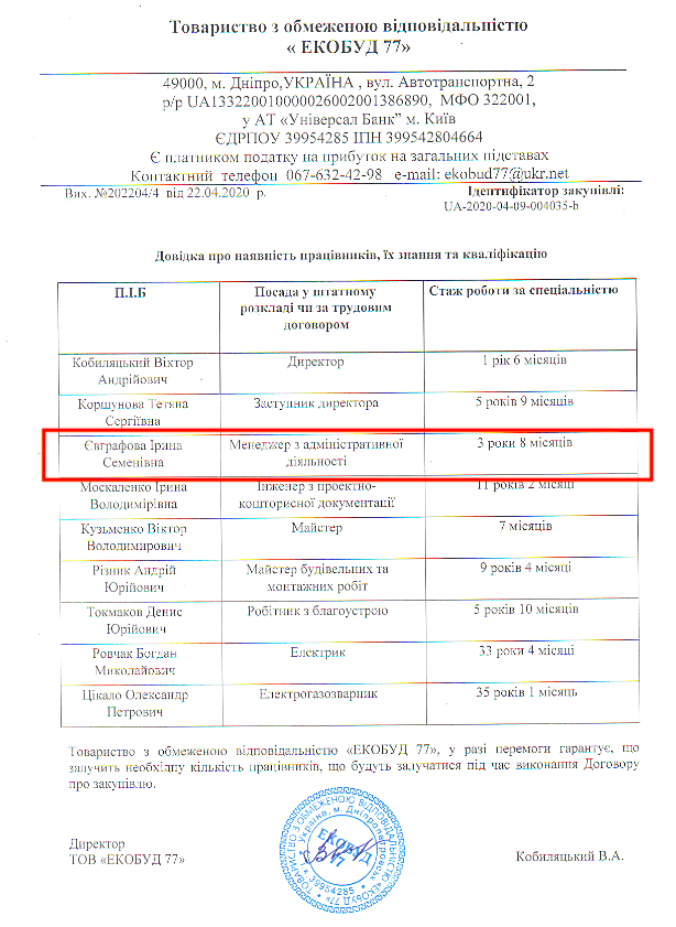 Согласно справке о наличии квалифицированного персонала, поданной «Экобуд 77» на тендер КП «Дирекция территорий и объектов рекреации» Днепровского горсовета на ремонт элементов благоустройства в сквере Героев-Чернобыльцев, Ирина Евграфова трудоустроена в «Экобуд 77» менеджером по административной деятельности. Следовательно, о реальной конкуренции между компанией Евграфовой «Экобуд 77» и ФЛП «Кобыляцкий Виктор Андреевич» говорить не приходится.